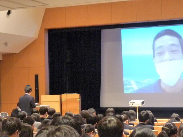 第1部は、平和学習です。沖縄と中継を結んで、担当者の方から、語り部の方のインタビュー映像を視聴し、周囲の級友たちと感想を共有しました。その後、代表して2名の生徒が質問に答え、平和学習部分を終了しました。