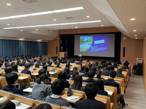 英語での講義が7割を超え、留学制度も充実し、語学を含めたサポート体制も充実しています。成績優秀者には給付型の奨学金も各種あり、そうした特長を分かりやすくコンパクトに説明して頂きました。今はコロナ禍で大変な状況ではありますが、こうした時こそ、国際的なつながりが大事でもあり、意欲的な学生を育てたいというメッセージは、聴いていた生徒達にも伝わったようです。
