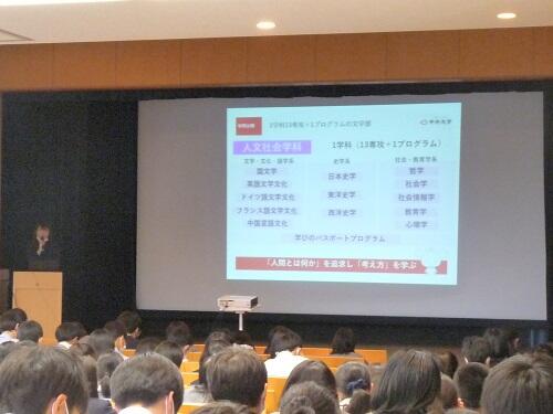 1学科13専攻という特色を持つ文学部に、来年度から新たに「学びのパスポートプログラム」という専攻横断的なコースが開設されます。そのような新時代を見据えたコースの他にも、文学部は「教職」「就職」、そしてもちろん「研究」にも強い学部でもあり、そうした特長を総合的にお話し頂きました。生徒達も、先週までの経済、法、商、といった社会科学系の学部とは異なる魅力を持つ文学部の話に耳を傾け、熱心にメモをとって聞いていました。