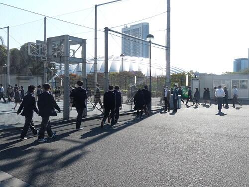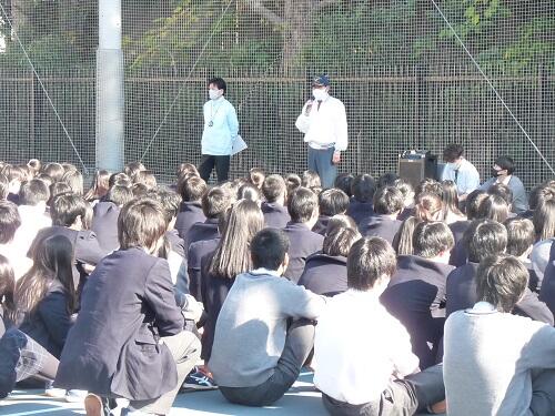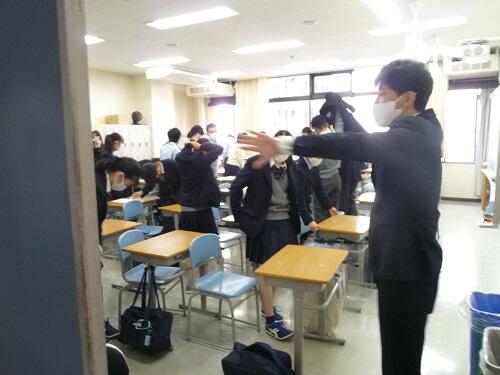 全校生徒および教職員で2020年度避難訓練を実施しました。授業中に地震が発生したことを想定し、生徒は教室にて机の下に身を隠し、安全を確保したのち、各学年の避難経路より後楽園多目的コートへ避難しました。訓練終了後には、中央大学後楽園キャンパス自衛消防隊長より講評をいただきました。
