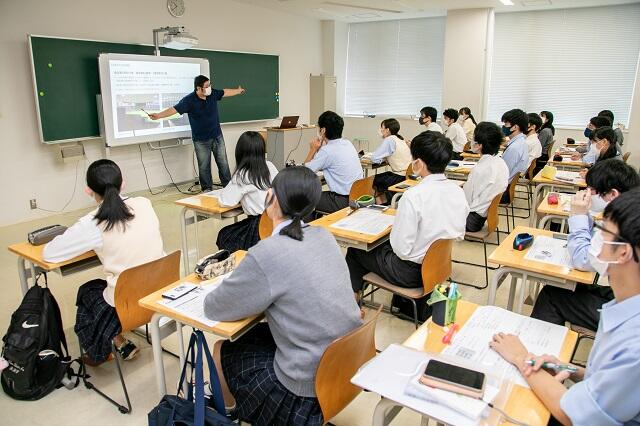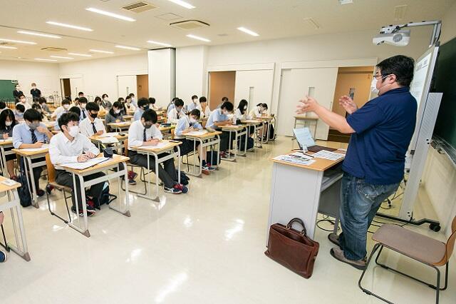 大学の先生でありながら高校教育への理解も深い武田先生は、高校と大学の違いを意識されつつ授業を展開されており、42名の生徒達は、興味深く受けていました。