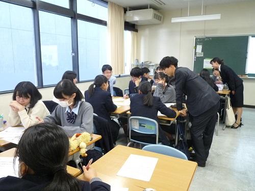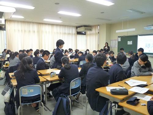 最初の30分は小ホールにおいて、学年全体に対し、クイズを交えながらのインドネシアの紹介、貧困層の問題が提示されました。その後、休憩を挟んで各クラス6~7名の班に分かれて課題解決の方法に取り組みました。課題とは、「インドネシアにおいてワクチン接種を普及するためには何が必要か」というものでありました。生徒達はゼミ生の皆さんのファシリテートもあってうまく答えていたようです。その回答を踏まえて、ゼミ生の皆さんがインドネシアで学んだ課題:宗教上の問題や副作用に対する懸念などを紹介し、一筋縄ではいかない現状を報告されていました。
