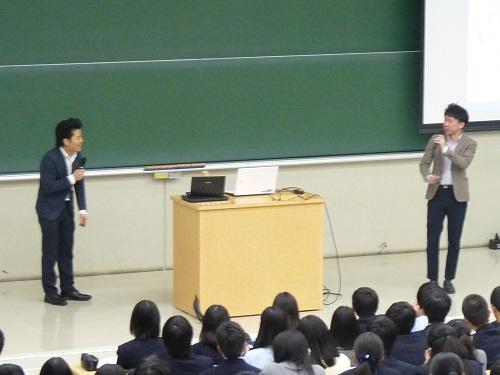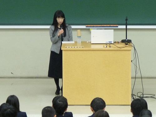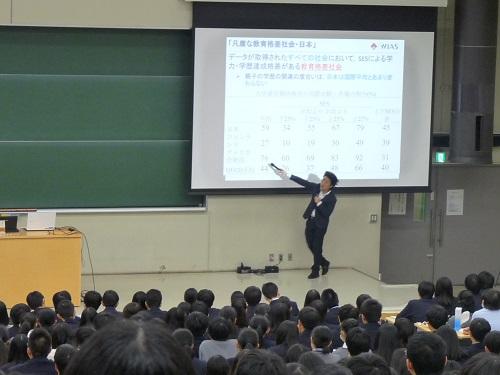 まず、皆さんは大変恵まれた環境にいること、その環境から今の自分がいることに相関性があること。つまり、環境によっては本校に通えないこともあることを話されました。今現在の日本は、比較的格差のない流動性の高い社会と言われているが、実は戦後から現在に至るまで、緩やかな「身分」社会であることをデータで示されました。そうした現実を知り、恵まれた存在であるからこそ、そのような社会を変えていくために努力することが大切だと説かれました。