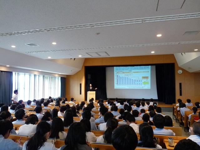 6月8日(土)1・2時間目に1年生の総合的な探求の時間の一環として、株式会社office3.11、栄養学博士の井出留美先生に「賞味期限のウソ、食品ロスはなぜ生まれるのか」という演目で講演をしていただきました。食品ロスの問題を諸外国と日本の比較から、その削減の第一歩として私達が日常的にできることまで話していただき、身近な問題だけに生徒達は興味深く熱心に耳を傾けていました。