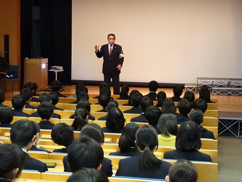 第二部では、未成年者が暴力団の手先となって特殊詐欺に加担し、自らも犯罪者となってしまう事例を、映像で視聴しました。事件当時、高校生など未成年であった当事者の人々が、現在の心境を語る映像は、軽い気持ちで手を染めたことが大きな犯罪に繋がっていく恐ろしさをしみじみと感じさせる映像で、生徒達も真剣な表情で画面を見つめていました。