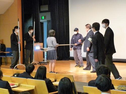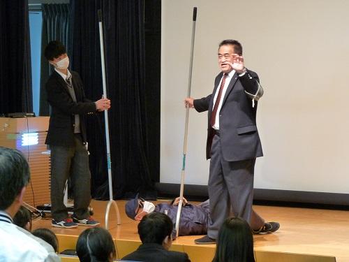 2月4日に富坂警察署の方を講師に呼び、1年生対象の不審者対応訓練および、特殊詐欺に関する学習会が行われました。第一部では、不審者対応の実技講習があり、舞台上で不審者に扮した警察の方とともに生徒および教職員が校内で不審者を発見した時の声のかけ方や、その際の身の守り方等を練習しました。不審者との受け答えの仕方や、その際の距離の置き方等、実践的で役に立つ指導があり、非常に有意義な講義でした。また、「さすまた」を用いて不審者を取り押さえる練習では、女子生徒も参加し、複数の人間で協力して不審者を確実に取り押さえる効果的な方法を学習しました。