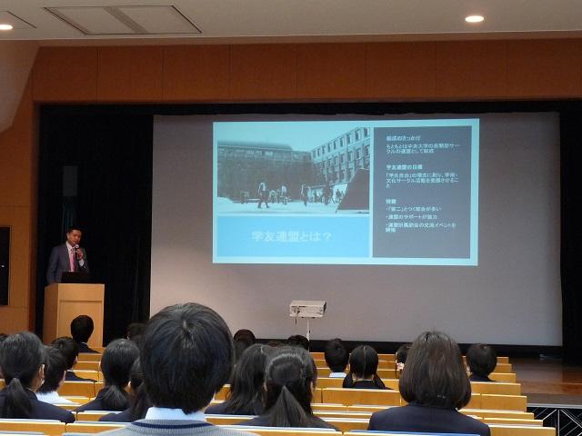 3年生LHRにて、中央大学に進学予定の生徒に対し、中央大学学友会体育連盟に所属する学生より中央大学学友会の紹介をしていただきました。冒頭に学友会の7連盟の紹介をした後、体育連盟各部会の活動紹介へと移りました。本校の卒業生が紹介者として来ている部会もあり、附属校出身者でスポーツ推薦でない学生や大学から競技を始めた学生でも試合で活躍をしている方もいるという話が聞けました。