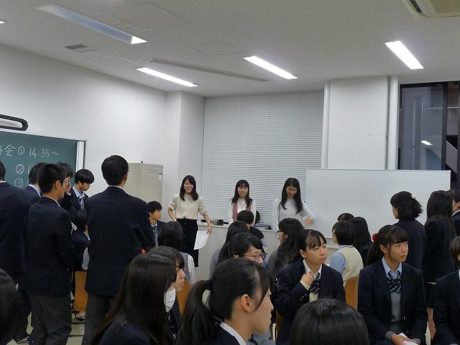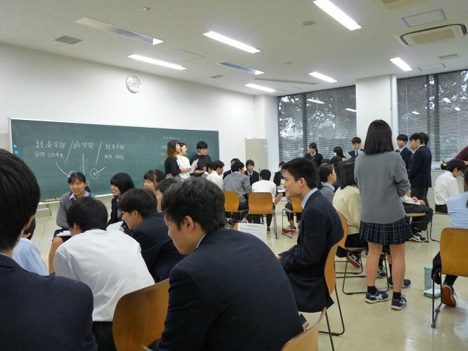 白灯会(本校同窓会)のご協力の下、現役大学生・大学院生40名が参集し、高校生の進路選択の一助にと、キャリア教室「先輩後輩交流会」を開催いたしました。第1部では、小ホールにて中央大学の各学部の授業時間割を示し、大学生活の様子を語っていただきました。第2部は分科会として中央大学6学部および他大学受験別のグループに分け、詳しく大学生活について話していただき、質問・応答の時間を設けました。生徒達にとっては、進路について考える良い機会になりました。