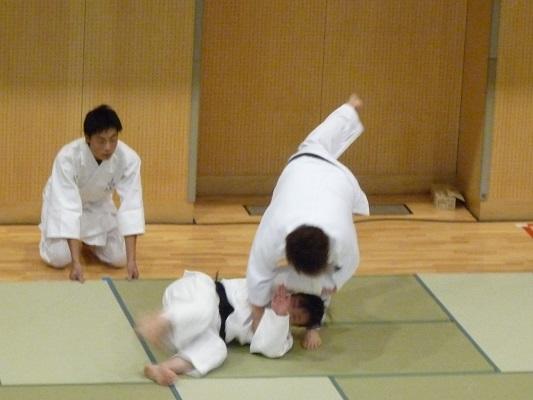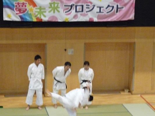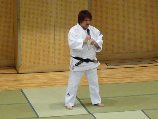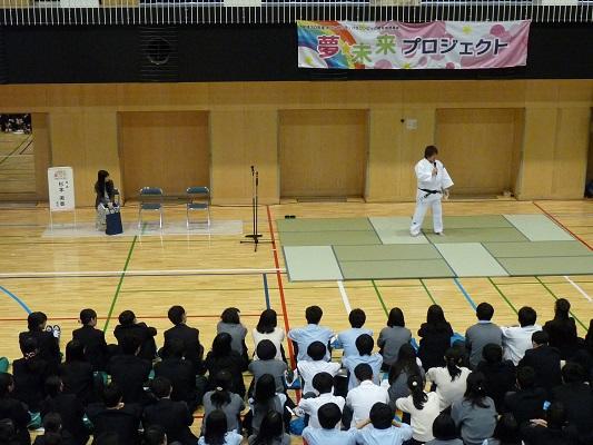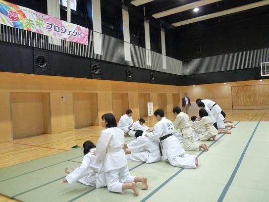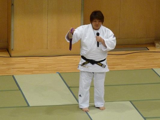 今回、本校での講座は二部構成で行いました。第一部は全校生徒を対象とした、杉本さんの軌跡をまとめたDVDの鑑賞・講演会・模範演技・質問コーナー、そして第二部は希望者対象の実技指導です。第一部のDVDは、現役を引退された杉本さんの選手時代の姿を見ることができました。講演は、杉本さんの明るい人柄がよく伝わってきました。模範演技では、本校教員が一本背負いで投げられたときすごい迫力がありました。質問コーナーで、「杉本さんが一番食べていたときは、どれくらい食べましたか?」という質問に「毎食、3合です。」とおっしゃったとき、会場が少しどよめいていました。第二部は26名の生徒が参加して、この日のために用意した72枚の畳の上で、受け身の練習や、身体を使ったじゃんけんと手押し相撲などをして楽しんでいました。「投げられたい人いる?」という問いかけに、多くの生徒が手を挙げて、本当に投げられました。感想はみんな「痛い」でした。参加した生徒は最後に銀メダルに触れることができたので、その重さに感激していました。わずかな時間ではありましたが、「夢を大事にして下さい」という杉本さんからのメッセージが、生徒たちにしっかり届いた総合学習講座になったと思います。杉本さんどうもありがとうございました。