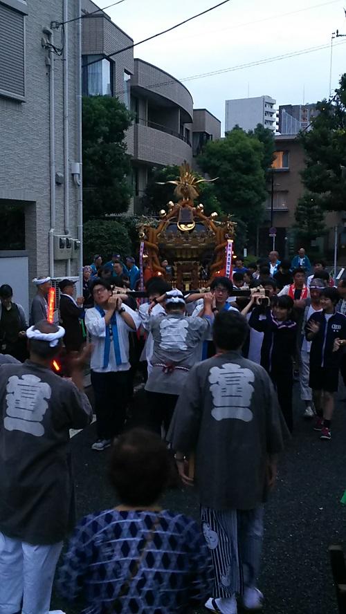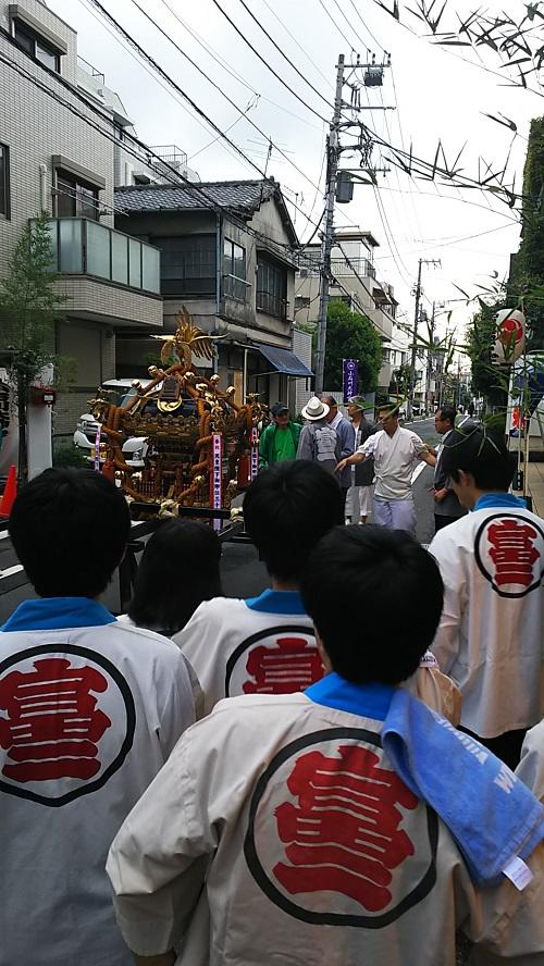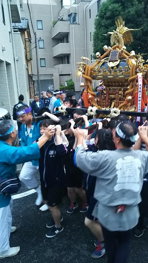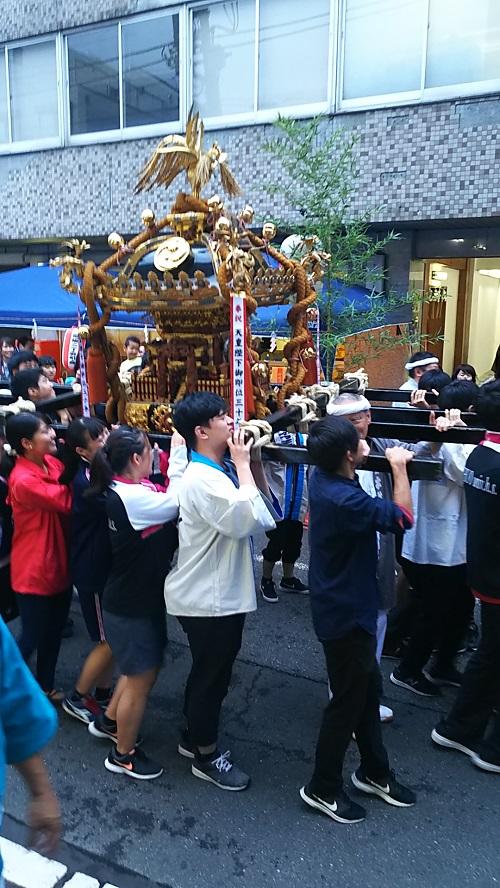 9月15日(土)に昨年に引き続き、富坂二町目町会の大神輿渡御に参加しました。 今年は生徒会生徒に加えて、テニス部男子、当日参加の生徒と総勢40名ほどの生徒で神輿を担ぎました。小さい頃からずっと地元の神輿を担いでいる生徒もおり、昨年よりも活気に溢れていました。町会の方に威勢の良い声を掛けていただき、楽しく参加できました。