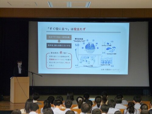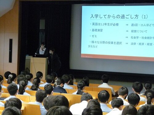 専門性というより、社会の諸問題に複数領域・分野からアプローチし、その解決方法を模索・提案する学問。そのために「外国語」「情報処理」「文化」「政策」という四柱を掲げているとのことです。 学部事務室の方の熱弁に加え、在学中の本校卒業生も来校してくれ、身近に感じることが出来ました。