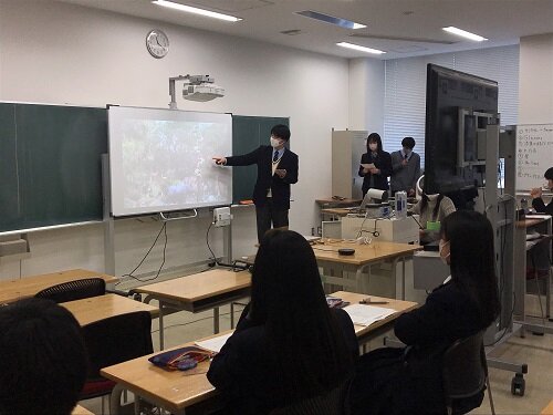 土曜日の探究活動の成果を1年生の全チームで一度行い、その中から選抜された班が、今回さらに内容をブラッシュアップして発表に臨みました。離れた教室での発表をオンラインで配信する形式で行い、生徒達は教室のプロジェクターに映し出される同級生のプレゼンテーションに見入っていました。内容も固いものから笑いの要素を入れたものなどグループ色が出ており、バラエティーに富んだものになっていました。