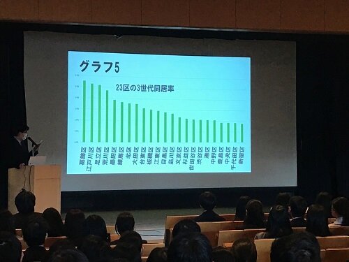 今回は、2学年の中から、選抜された生徒が同級生の前で発表しました。その際、1年次より複雑な統計処理を行うことを求めていることから、連携を行っている経済学部から専門の先生をお招きして、ご講演と発表会に際してコメントを頂きました。