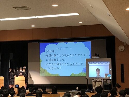 さて、実践講座は8チームに分かれて、社会に存在する課題を発見し、その課題解決を提示する過程で自分を見つめ、「志」を発見することを目的としています。その成果を小ホールにおいて発表しましたが、2年生はその場で聞き、1年生は各教室においてライブ配信で視聴することとなりました。