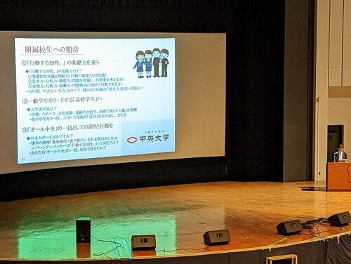 さて、ウエルカムイベントは、中大を代表して学長の河合先生が中大ファミリーとして附属生を 歓迎する旨のご挨拶から始まり、続いて高大連携担当の副学長磯崎先生が、中大の良さと附属生に 対する期待を述べられました。その後、中大の若手職員と学生による企画映像(各附属校の卒業生と その学生を知る教員コメント)が流され、一体感を演出するものでした。