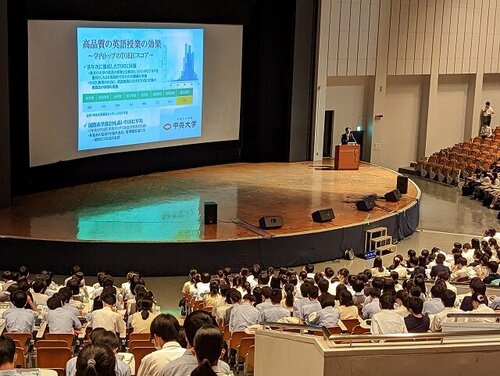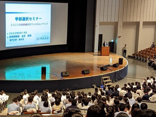 今年度から総合学園構想の一環として、附属校対象の各種イベントが始まりました。 6月18日の土曜日は高校生対象の中大ウエルカムイベントと3学部の学部選択セミナー が開催されました。本校からは1年生約160名は全員参加、2、3年生は興味のある 学部を聴講するという形をとり、多い時では約330名となっていました。