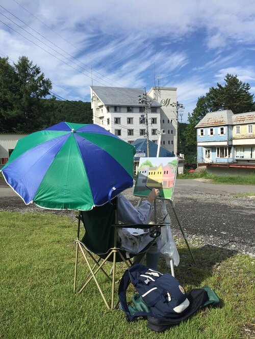 青く済んだ空、はるか彼方まで広がる山々に囲まれ伸び伸びと油絵を制作しました。途中悪天候により室内での制作もありましたが、美術室では味わえない開放感の中、伸び伸びと制作に打ち込めました。