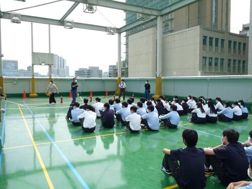 最後に、今年の防災週間が8月30日~9月5日なので、防災への意識の向上とともに消火器やAEDの位置確認などを忘れないようにしてくださいとのことでした。全部で15分くらいの講習でしたが、受講した生徒達は熱心に聞いていました。
