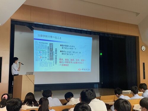 今回は、法学部事務室から漆原 徹さまにお越し頂き、法学を学ぶ意義、学部の特色など多彩なお話を伺いました。 法学を学ぶためには、経済や心理学、国際情勢など幅広い分野を学ぶ必要があること、実際の大学での学びの奥深さなど興味深いお話をしていただき、生徒たちは熱心に聞き入っていました。