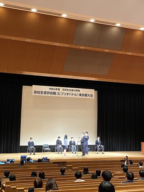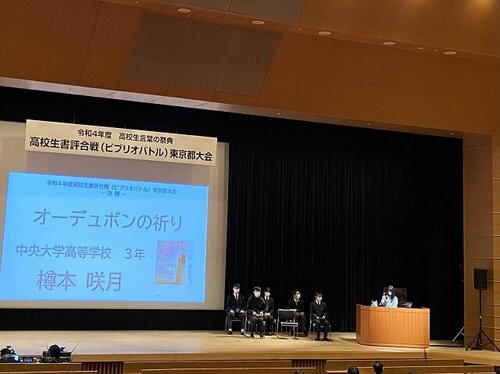 10月30日に行われた令和4年度高校生言葉の祭典「高校生書評合戦(ビブリオバトル)」東京都大会(帝京平成大学池袋キャンパス冲永記念ホール)に本校生徒(3年生)が出場し、そこで紹介した伊坂幸太郎『オーデュボンの祈り』がチャンプ本に選ばれました。