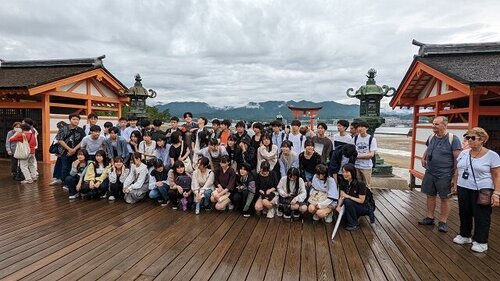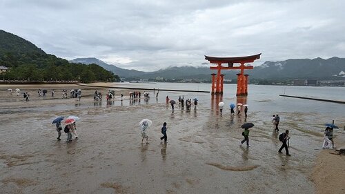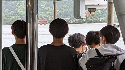 二日目の朝も雨模様でしたが、宮島に着くくらいには傘なしでも大丈夫になり、朱の鳥居を背景に(G7首脳と同じ位置)集合写真を撮ることが出来ました。