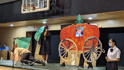 ※写真は、1年生4クラスのステージ写真とそれを観る生徒です。