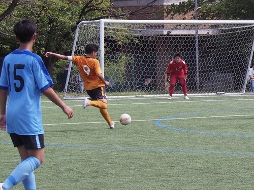 全体的に中大高がシュートを多く打つ攻撃が出来ていたため、前半40分に先制点を決めることができました。しかし後半では相手にセットプレーの機会を多く与えてしまい、1点決められてしまいました。それでもベンチも含めた全員で声を出し合い、後半30分に2点目、さらに試合終了直前には3点目を決めて、見事勝つことが出来ました。