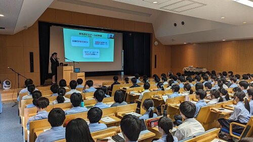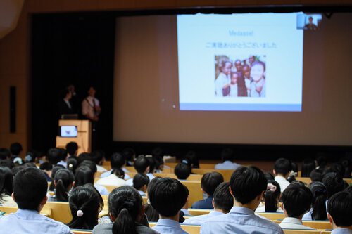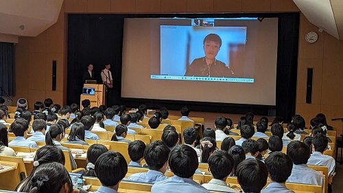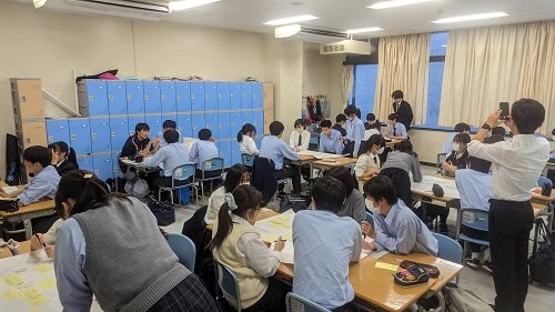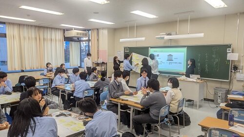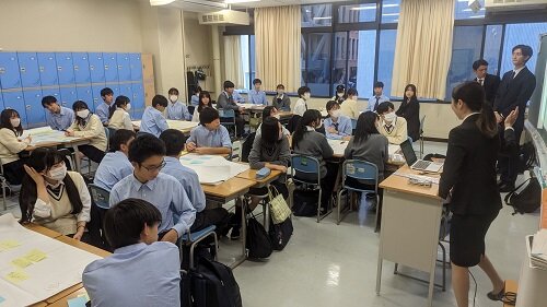 経済学部と本校では数多くの高大連携活動をおこなっておりますが、26日の1年生5・6限を使って、経済学部の林光洋先生のゼミ生が来校し、課題解決型学習を行いました。最初は全員が小ホールに集合し、林ゼミの活動報告と本校卒業生かつ林ゼミOBがアフリカのガーナに赴任していることから、オンラインでアフリカの現状を報告してもらうとともに自分のキャリアを振り返ってもらいました。生徒からも「アフリカの近代化の現状について」「アフリカにおける日本の存在感」について質問が出、先輩からの刺戟を大いにうけたようです。