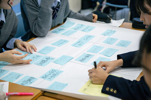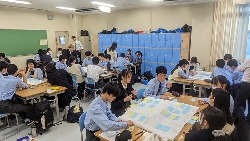 6限目は、教室に戻って、班別のグループディスカッションとなりました。林ゼミの主要テーマであるフィリピンの貧困格差を埋めるためにどうすればよいのか、「フィリピン国内からの視点」「海外からの視点」に分けて考えようとするなど、論理的な思考力が問われる活動となっていました。最後はグループでの意見をクラス全員の前で発表し、ゼミ生の皆さんからコメントを頂いて終了となりました。普段の授業で習ったことが出てきたりするなど、高校での学習も大切であることを再認識する機会にもなったようです。