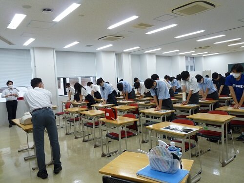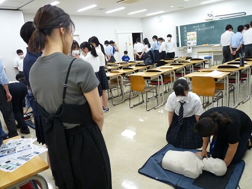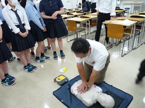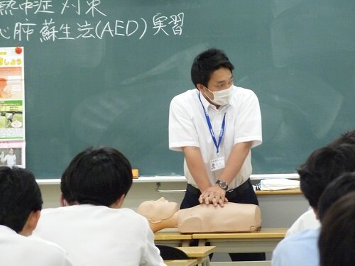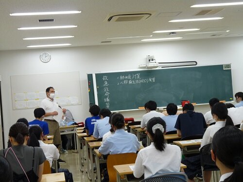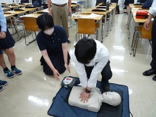 綜合警備保障株式会社から講師をお招きし、AEDを使用した心肺蘇生法の講習会を行いました。各部活からの代表者2~3名と教職員が参加しました。課外活動や日常生活の緊急時に備え、AEDの正しい使用法を実習しました。また講習会後には、養護教諭より、熱中症の予防法・対処法について講義を行いました。