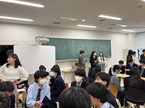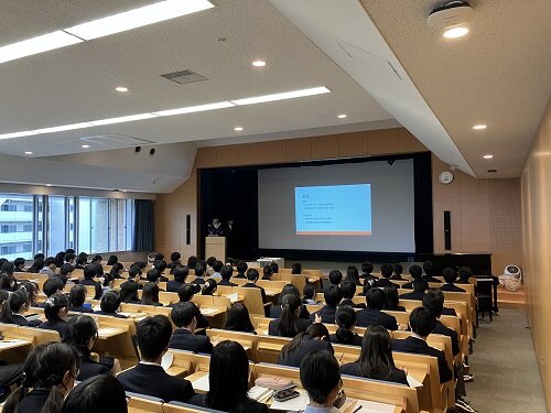 今回の説明会では、小ホールで大学のカリキュラムや大学生活について説明がなされたうえで、各教室のブースにわかれて学部ごとの説明と相談が行われました。ブースは中央大学の8学部と、他大受験を考えている生徒向けのブースからなり、生徒たちは関心のあるブースを三つ選び、現役の大学生から話を聞くことができます。大学での学びや学生生活、高校時代の進路の決め方など、生徒たちは卒業生にさまざまな質問を投げておりました。大学生のリアルな話を聞くことができ、自らの将来の進路を考える良い機会になったことでしょう。