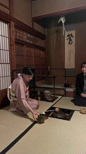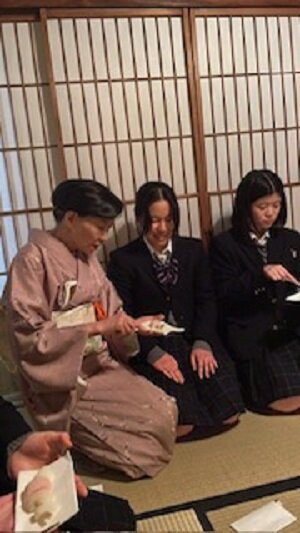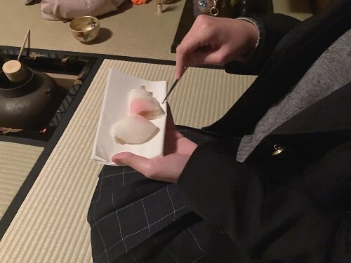 先生のお宅のお茶室にお邪魔し、新年の伝統的なお飾りを拝見したり、初釜ならではのお菓子をいただきました。季節感を大事にする茶道において特に大事な年中行事の一つである「初釜」を経験できて、茶道の奥深さの一端を体感しました。感謝の気持ちでいっぱいです。これから日々のお稽古にますます励みます!