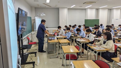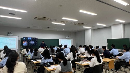 通常は大学からの授業配信を高校教室にて受講する形ですが、10月1日(火)は担当の武田勝先生が来校し、高校教室からの配信授業が行われました。