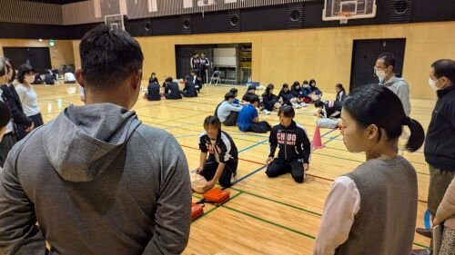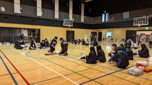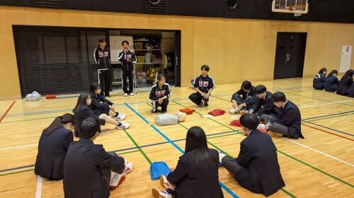 本校からはクラブごとに選抜された50名の生徒と教職員10名の計60名が参加し、同部から吉本主将、宮本さんを含む10名以上でお越し頂き、生徒5~6名あたり1名の部員の方から指導してもらうことが出来ました。大学生の皆さんという年齢が近い上に、非常に的確かつ親身な指導により熱心に取り組んでいました。胸骨圧迫(心臓マッサージ)実習は、想像以上に力が必要なため苦労している生徒も見受けられましたが、アドバイスとともに上達していました。